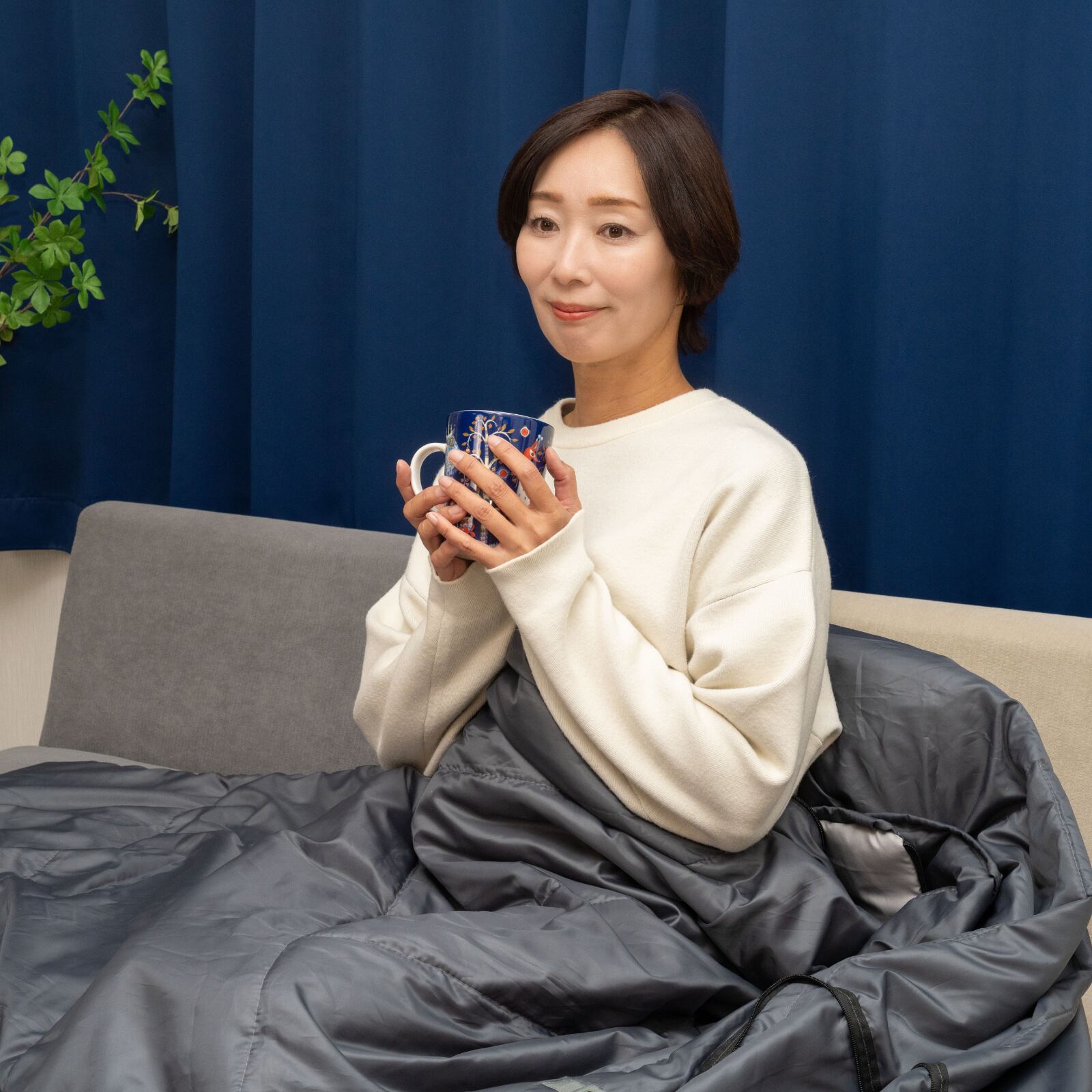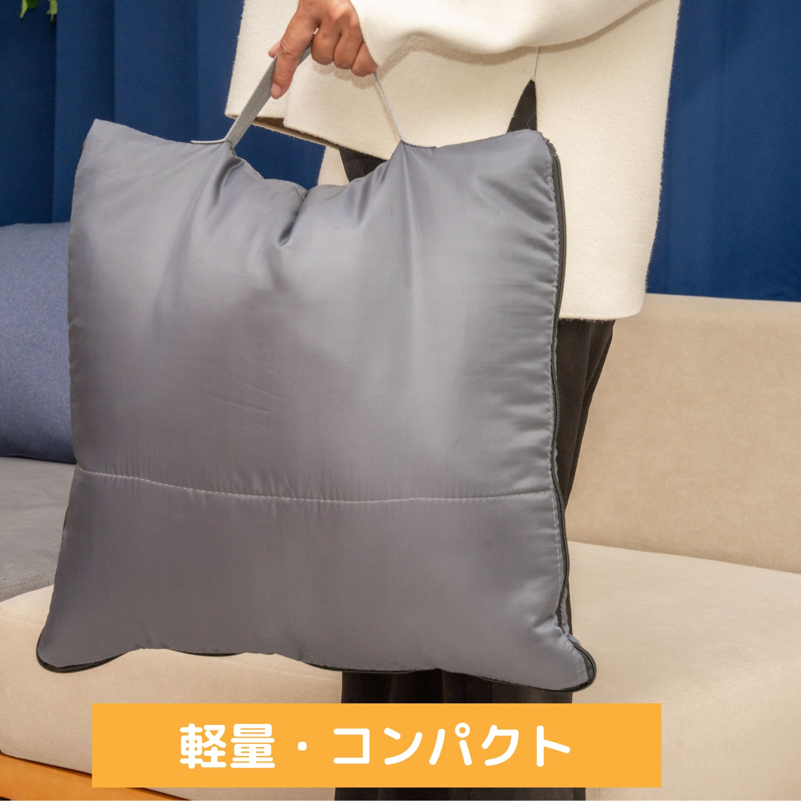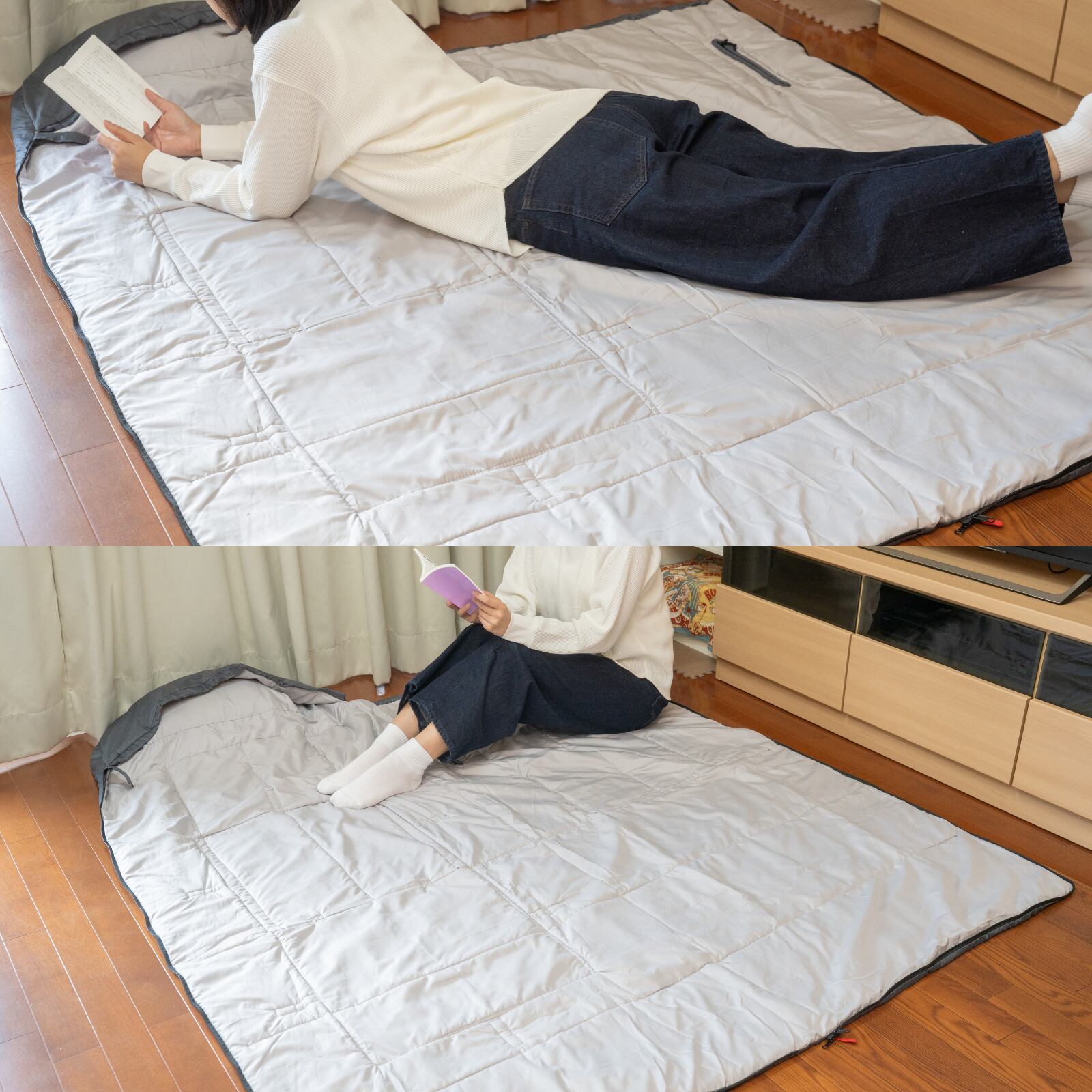 表面にファスナーが2か所ついていて、腕を出す事ができ、自由に手が使えて通常時は着る布団として、ラグとしてもお使い頂けます